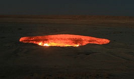Die Wüstenstrecke nach Darvaza ist nicht besonders aufregend, die Straße löchrig und ausgefranst, manchmal ist der Asphaltbelag gar nicht mehr vorhanden. Sehr schön ist die Fahrt über die Dünen und Sandstrecke zu dem 8 km von der Straße im Osten gelegenen Gaskrater, einem riesigen Loch, das durch die Explosion einer Erdgasbohrung entstanden sein soll. Aus dem Krater entweichen nun an den Seitenwänden an hunderten von Stellen Gase die seit über 30 Jahren brennen. Besonders eindrucksvoll ist der brennende Krater bei Dämmerung und Dunkelheit. Wir campen oberhalb und genießen den ungewöhnlichen Blick auf den glühenden Abgrund. Die durch die Flammen beleuchtete gegenüberliegende Kraterwand leuchtet in der Schwärze der Nacht wie ein glühendes UFO.